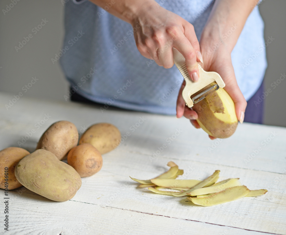 Woman hands peeling potatoes for boiling