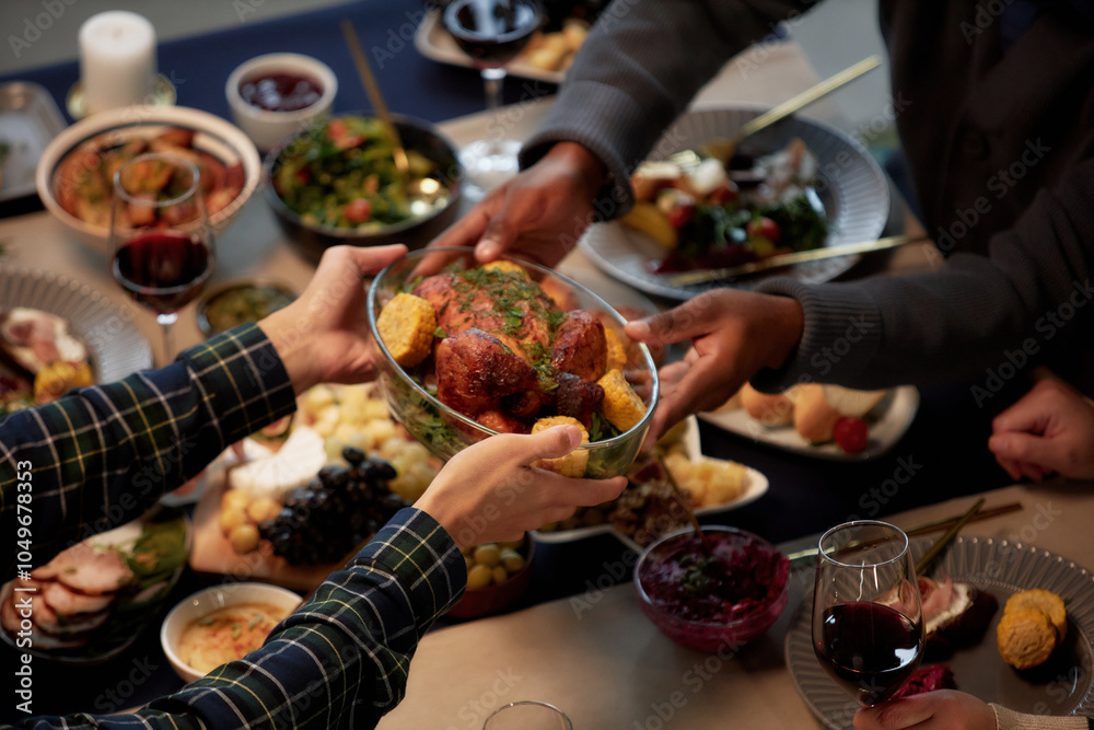 Cropped shot of man passing homemade roasted chicken to friend at dining table served with variety of festive dishes during Christmas dinner, copy space