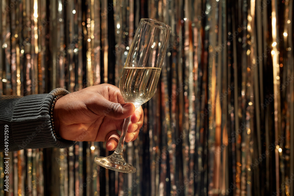 Cropped shot of Black man holding champagne flute celebrating Christmas at party while light glowing on glass with golden tinsel in background, copy space