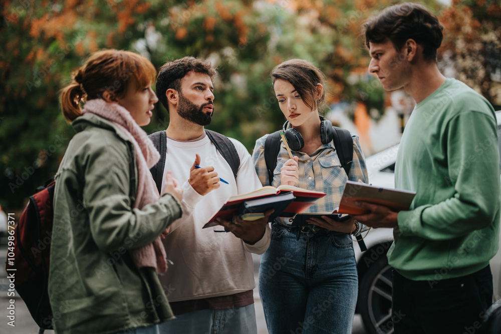 Four diverse students engaged in a lively discussion outdoors, surrounded by autumn foliage. They are holding books and notes, collaborating on academic projects in a relaxed setting.