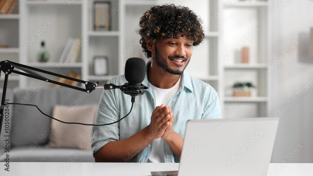 Microphone, podcast and Indian man speaker in his living room. Creative streamer, internet influencer or online content creator live streaming for audience.
