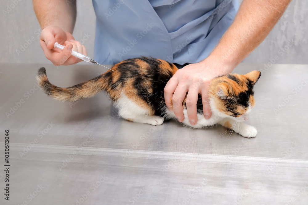 veterinarian in uniform giving vaccine injection to small tricolor kitten. veterinary clinic, pet treatment