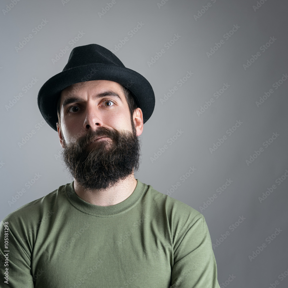 Skeptical bearded hipster staring at camera. Headshot close up portrait over gray studio background with vignette.