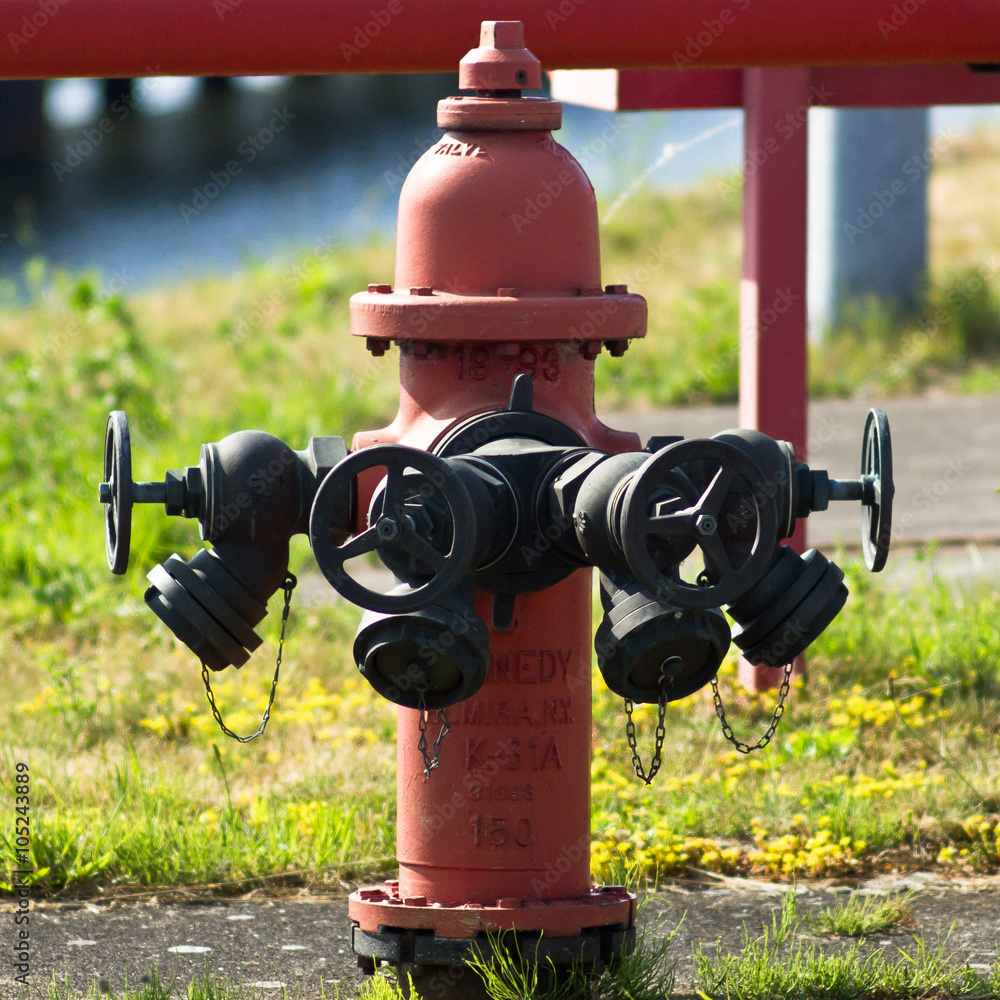 A square format photo of a red fire hydrant with four valves. The photo was taken at the 'Oranjesluizen' (floodgates) in Amsterdam, The Netherlands.