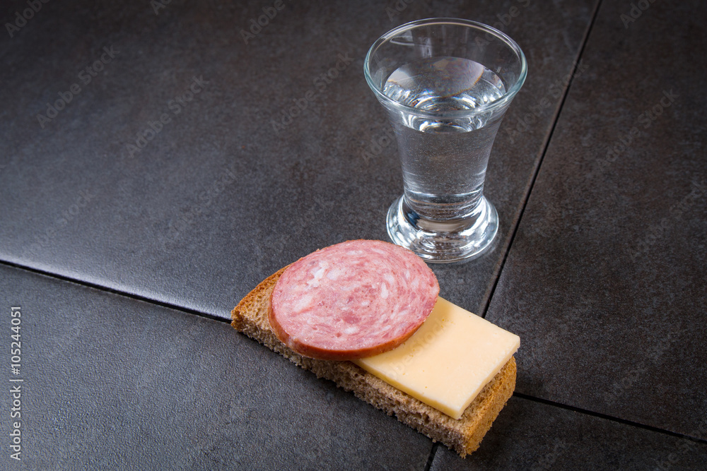sandwich with salami and cheese, a glass of vodka on dark stone background