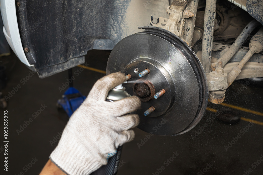 Auto mechanic cleaning a new brake disc from factory oil with a spray can, close-up