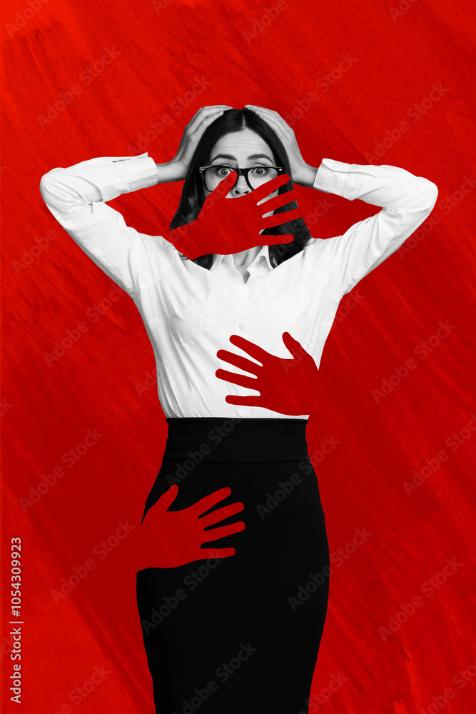 Vertical photo collage of scared girl hands close mouth harassment bullying violence problem discrimination isolated on painted background