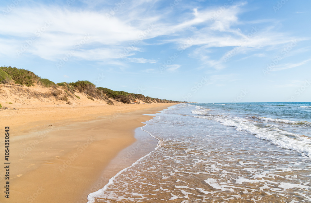 The sandy beach and dunes of Santa Maria del Focallo, on the shore of Mediterranean sea, municipality of Ispica, province of Ragusa, Sicily