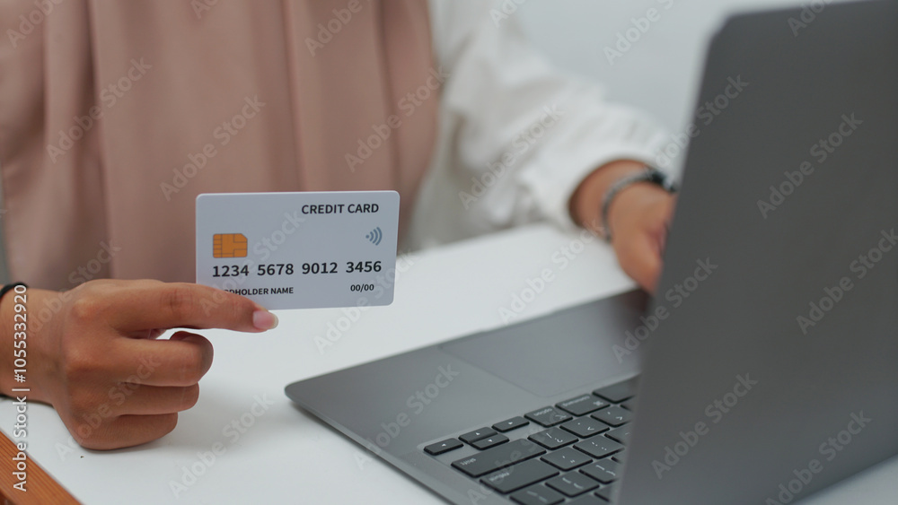 A person holding a credit card and a smartphone, ready to make a secure online purchase. With a confident smile, they enjoy the convenience of mobile banking and cashless transactions.