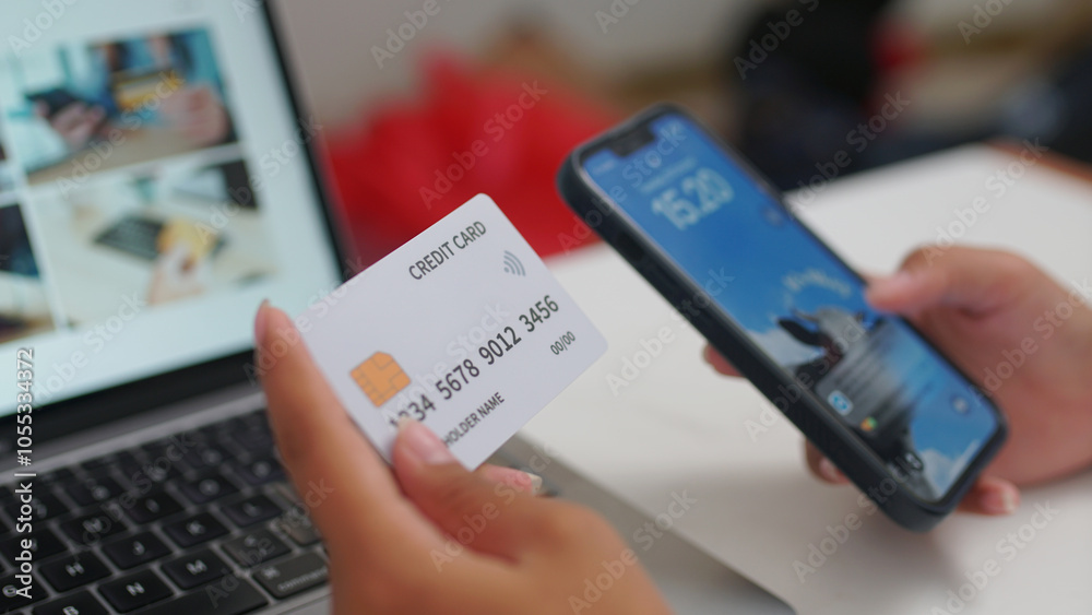 A person holding a credit card and a smartphone, ready to make a secure online purchase. With a confident smile, they enjoy the convenience of mobile banking and cashless transactions.