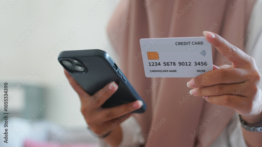 A person holding a credit card and a smartphone, ready to make a secure online purchase. With a confident smile, they enjoy the convenience of mobile banking and cashless transactions.