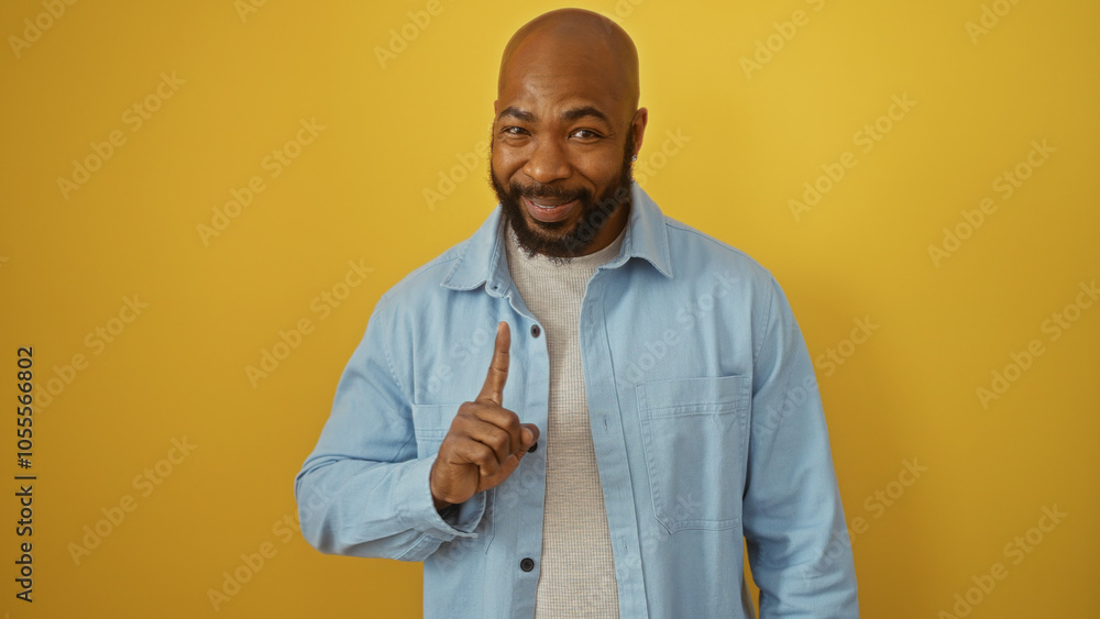 Handsome young african american man in casual attire pointing upwards against an isolated yellow background, suggesting or signifying something important with a confident expression.