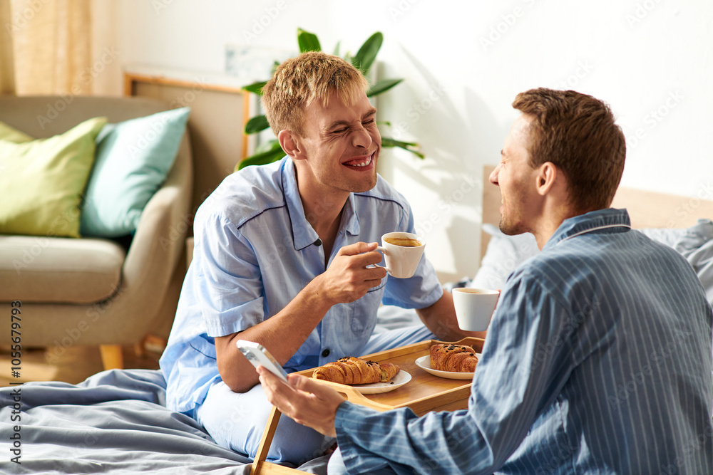 Two men in pajamas enjoying breakfast together, sharing laughter and affection in their bright bedroom.