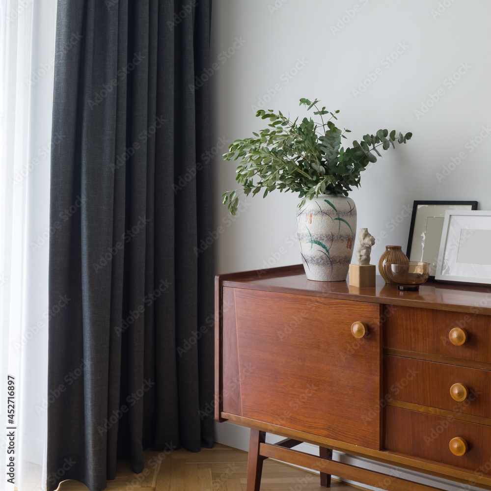 Fashion portarait of a young blonde girl in black strange dress. Autumn nature and tree branches. Black and white