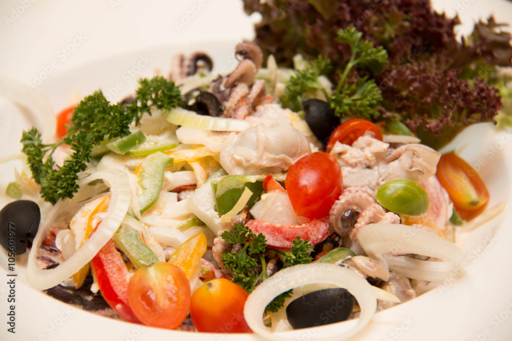 Delicious diet salad with green lettuce, red onion, slices and seafood