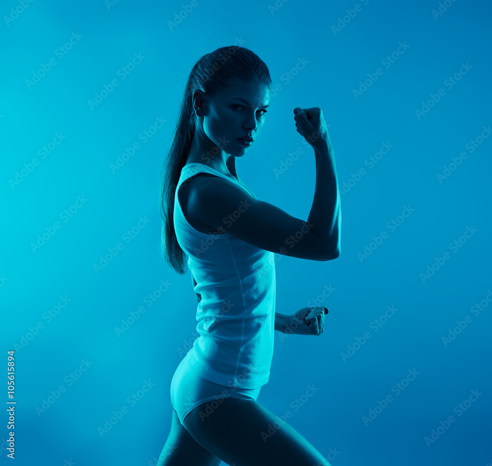 Fitness female with healthy athletic body posing in studio over blue background. Concept of dieting and slimming.