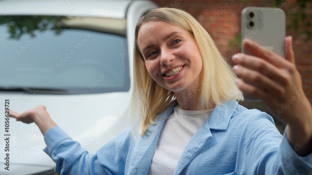 Cheerful Caucasian woman car owner client talking video call happy girl driver speak filming blog using mobile phone female businesswoman show new luxury automobile auto rent service in city transport