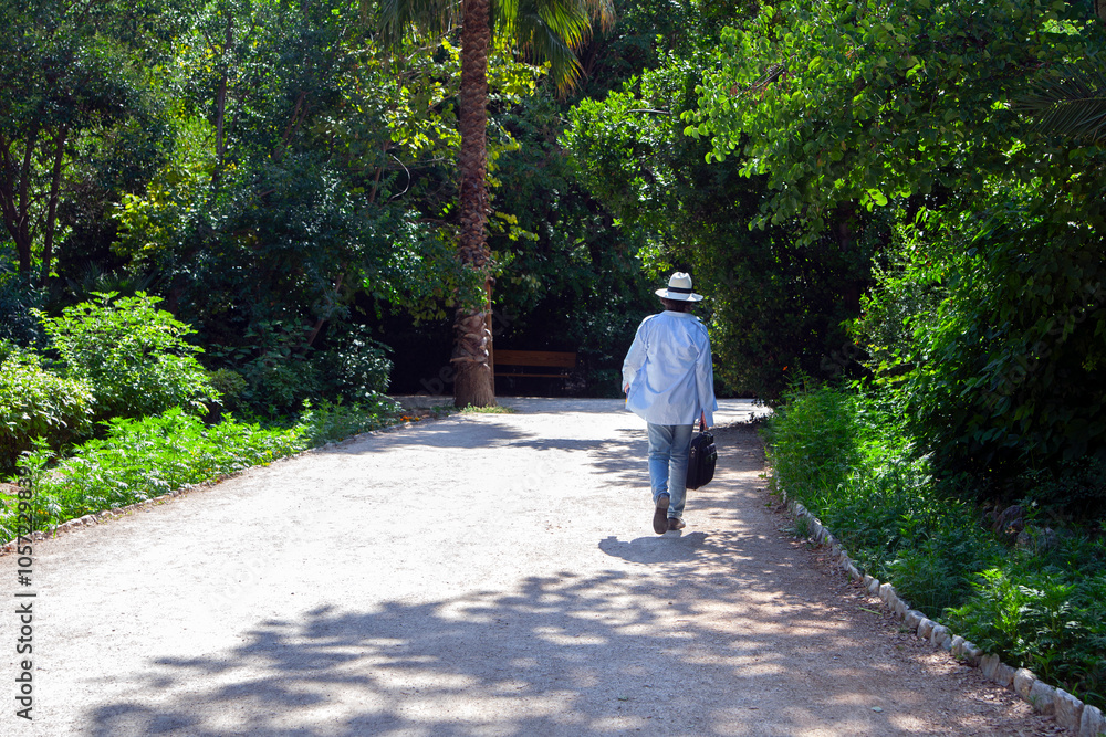 back view of a man walking in a park. National garden of Athens, Greece. sunny day