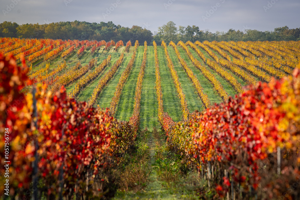 Autumn landscape around Bordeaux vineyards, Bordeaux Vineyard at sunrise in autumn, Entre deux mers, Langoiran, Gironde. High quality photo
