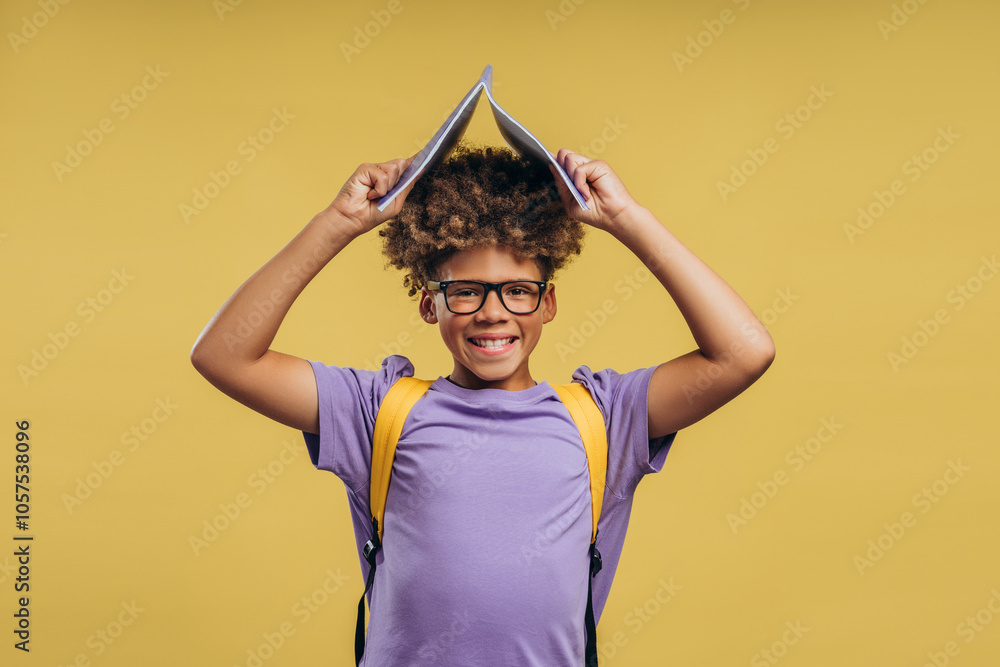 Smiling positive African American boy holding backpack and book on head, looking at camera