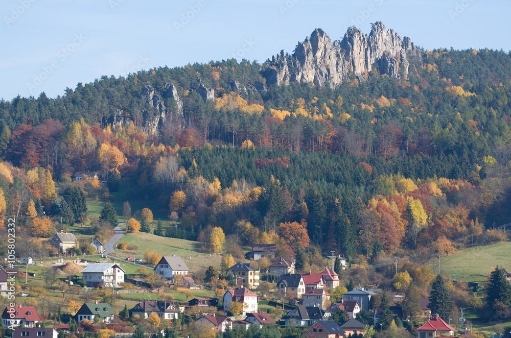 Sandstone rock Suche skaly over village Mala Skala in Bohemia Paradise (Cesky Raj), North Bohemia, Czech republic