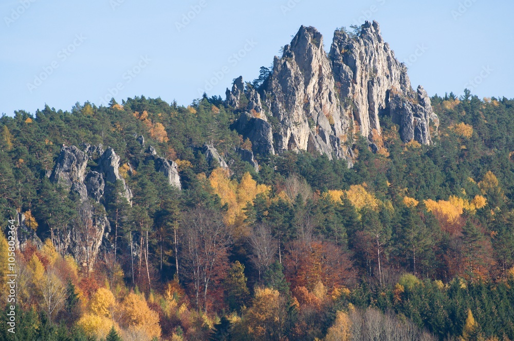 Sandstone rock Suche skaly over village Mala Skala in Bohemia Paradise (Cesky Raj), North Bohemia, Czech republic