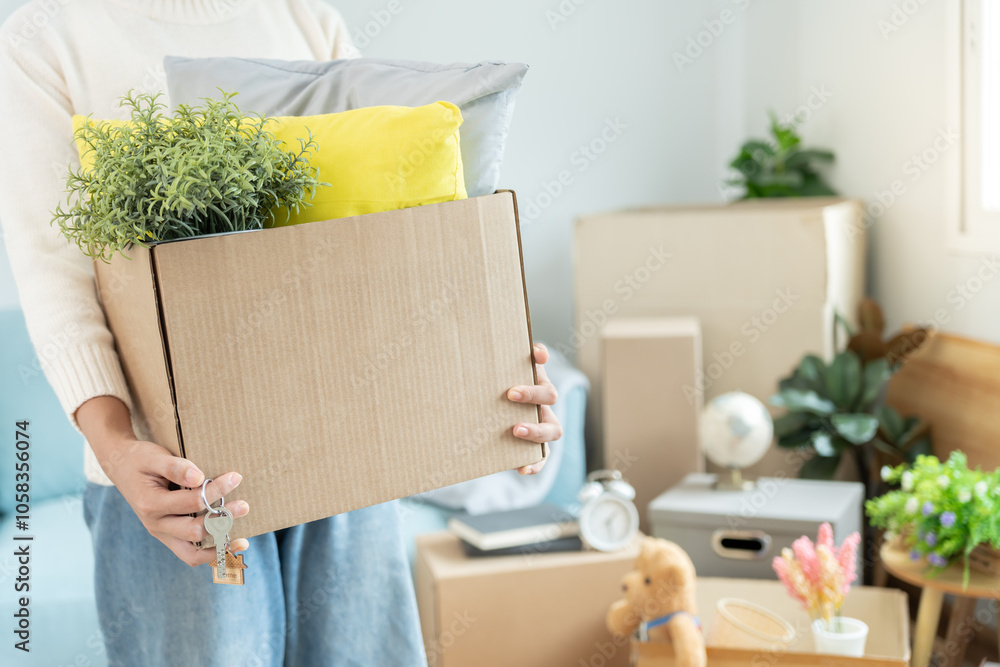 Moving house, relocation. Woman hold carton box contain equipment for new condominium, inside the room was a cardboard box containing personal belongings and furniture. move in the apartment