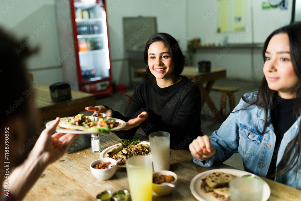 Attractive young blonde girl listens to music in big headphones, white background, copy space