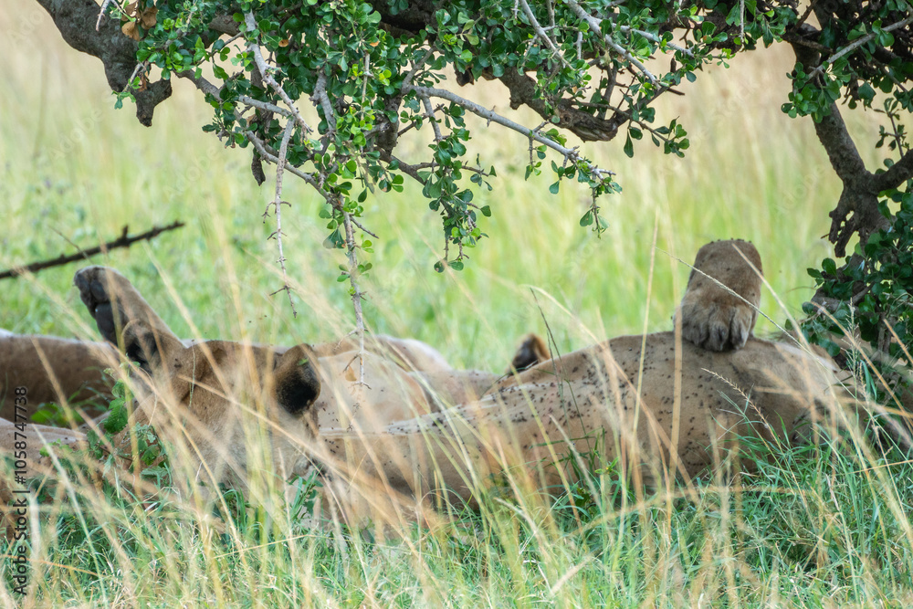 A pride of lions is currently resting and lying in the grass, Masai Mara, Kenya