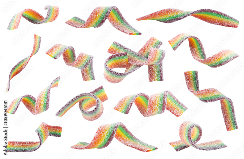 Set of rainbow sour jelly candies strips in sugar sprinkle on white background