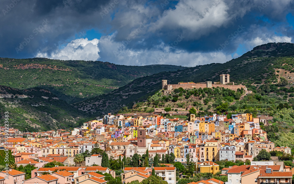 Storm clouds over the picturesque, historic town center of Bosa. Oristano, Sardinia, Italy