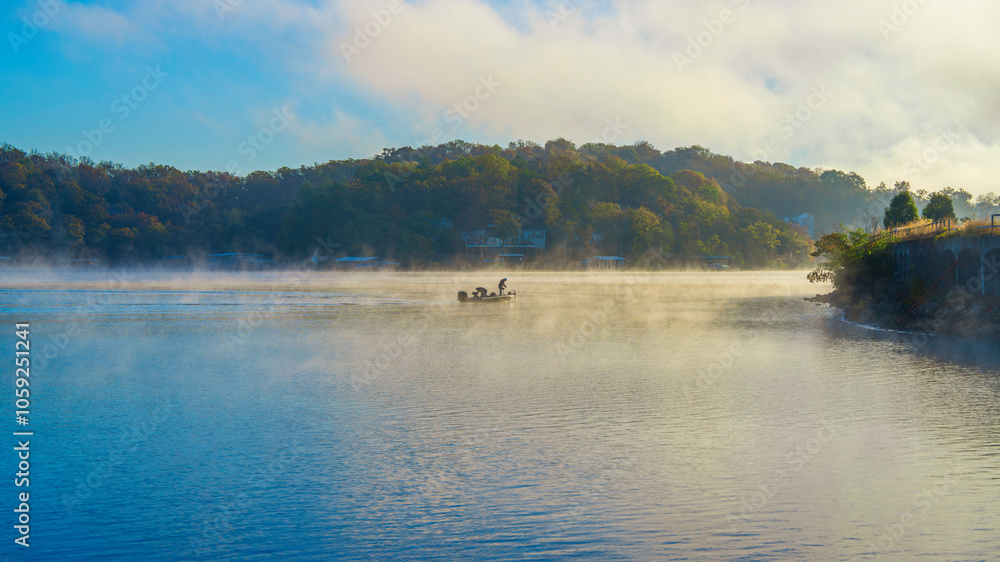 Sunrise with a fishing boat on a Foggy Morning at Lake of the Ozarks in Rocky Mount Missouri, USA