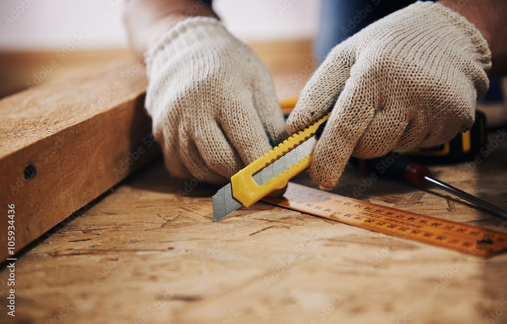 Handyman in gloves working with wood on the floor. Concept of home reconstruction and furniture improvement.