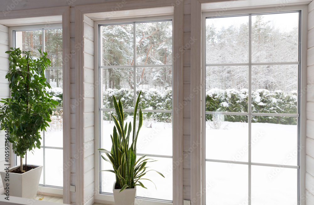 Large tropical indoor plants schefflera and sansevieria by a large panoramic window in a wooden house overlooking a winter garden. Snowy weather outside the window