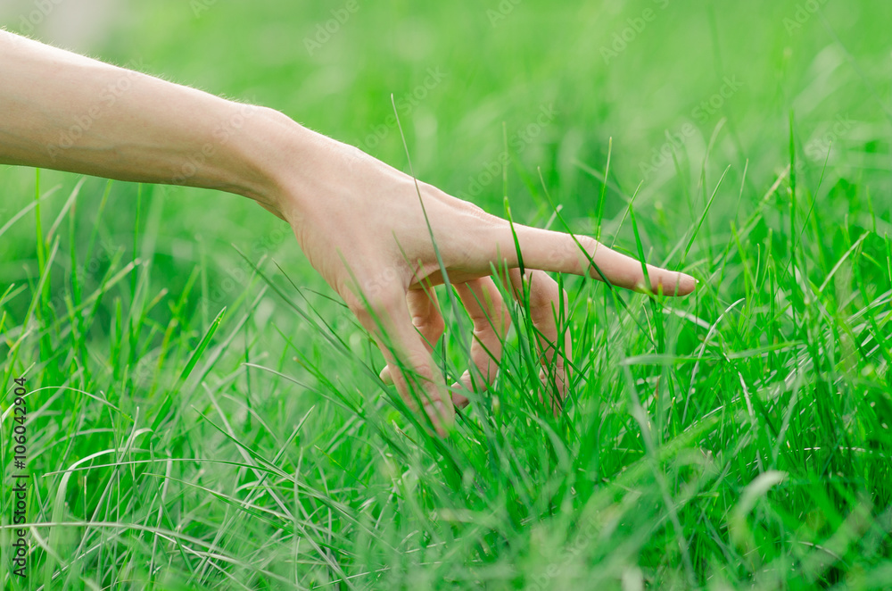 Spring and relaxation theme: the human hand touches a young fresh green grass in the garden
