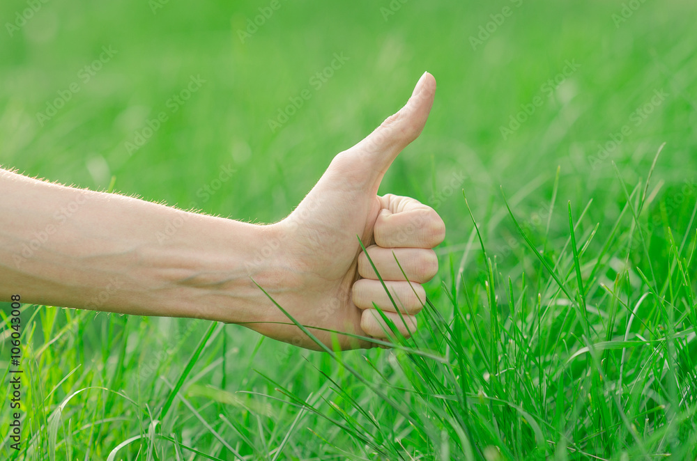 Spring and relaxation theme: the human hand touches a young fresh green grass in the garden