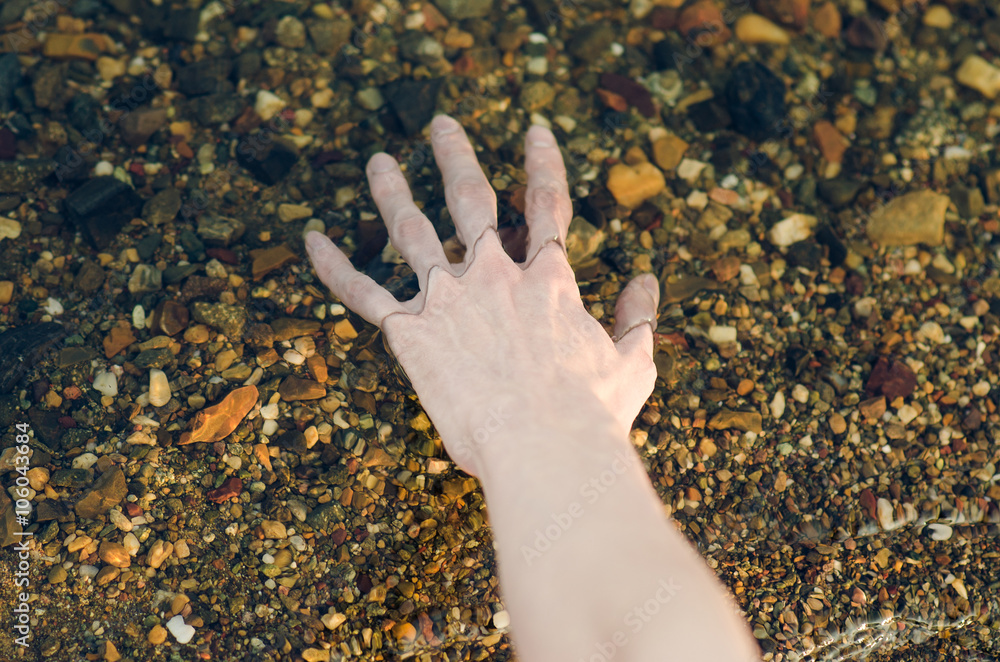 River water theme: the human hand touches the water in the river