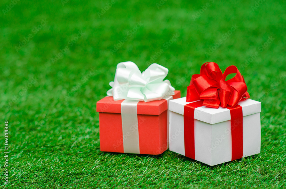 Gifts and congratulations topic: two beautiful boxes with gifts lying on green grass in summer