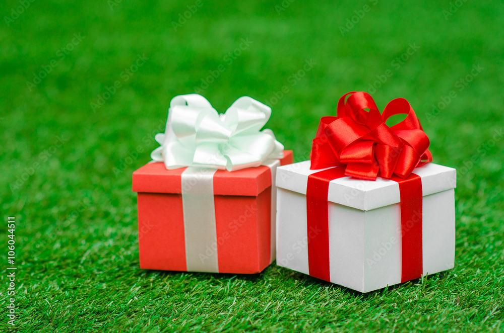 Gifts and congratulations topic: two beautiful boxes with gifts lying on green grass in summer