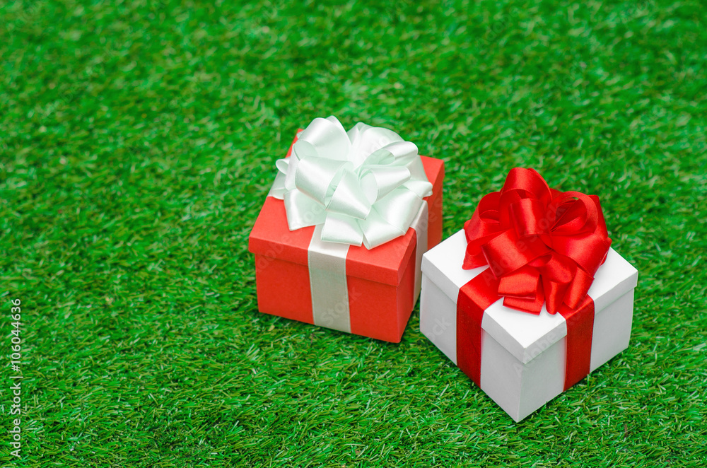 Gifts and congratulations topic: two beautiful boxes with gifts lying on green grass in summer