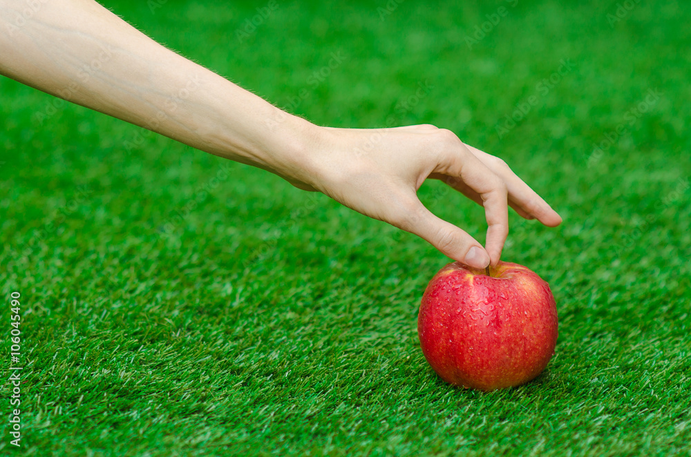 Vegetarians and fresh fruit and vegetables on the nature of the theme: human hand holding a red apple on a background of green grass
