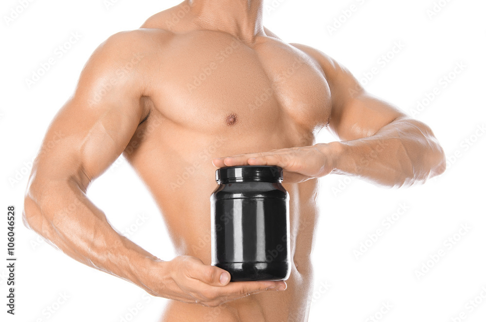 Bodybuilding and Sports theme: handsome strong bodybuilder holding a plastic jar with a dry protein and showing gesture isolated on white background in studio