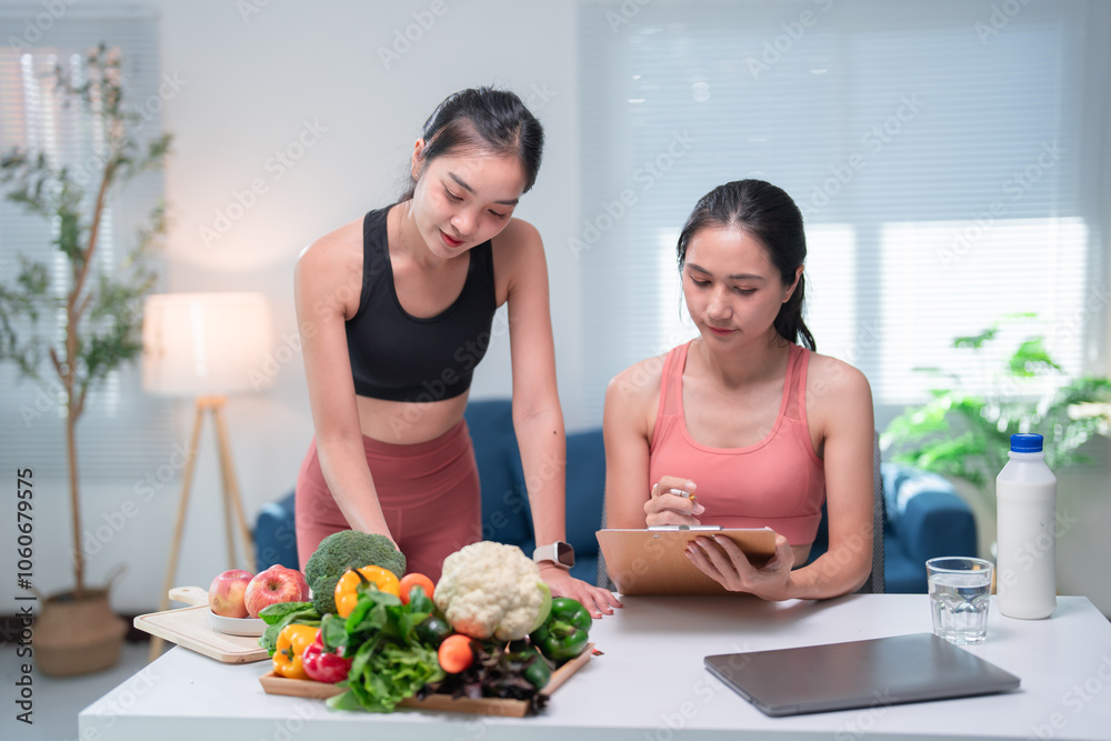 Young nutritionist helping her client create a personalized meal plan using fresh vegetables and other healthy ingredients, promoting a balanced diet and healthy lifestyle