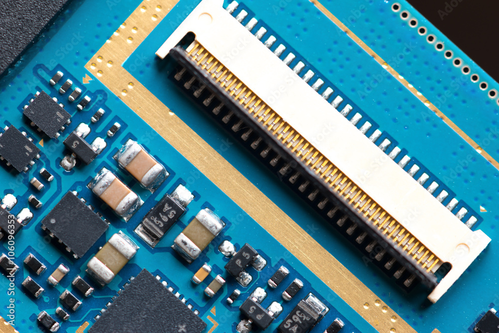Closeup of computer circuit board with radioelements