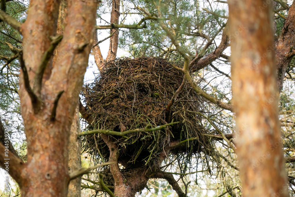 a massive buzzard nest (Cathartes aura) set high amongst woodland fir trees