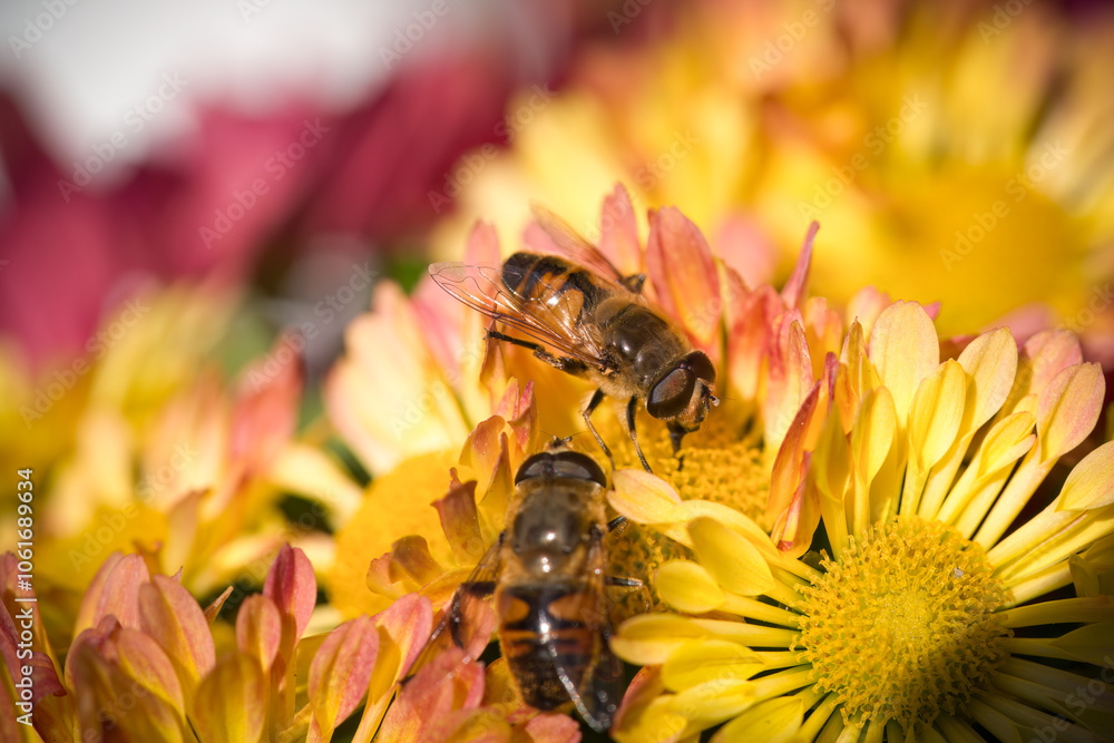 Closeup of a honey bee sitting on a azalee blossom at a sunny autumn day