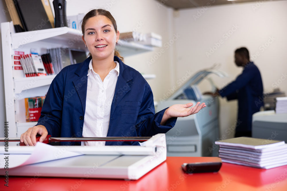 Portrait of cheerful young female typographer in uniform using paper cutter during work in printer shop