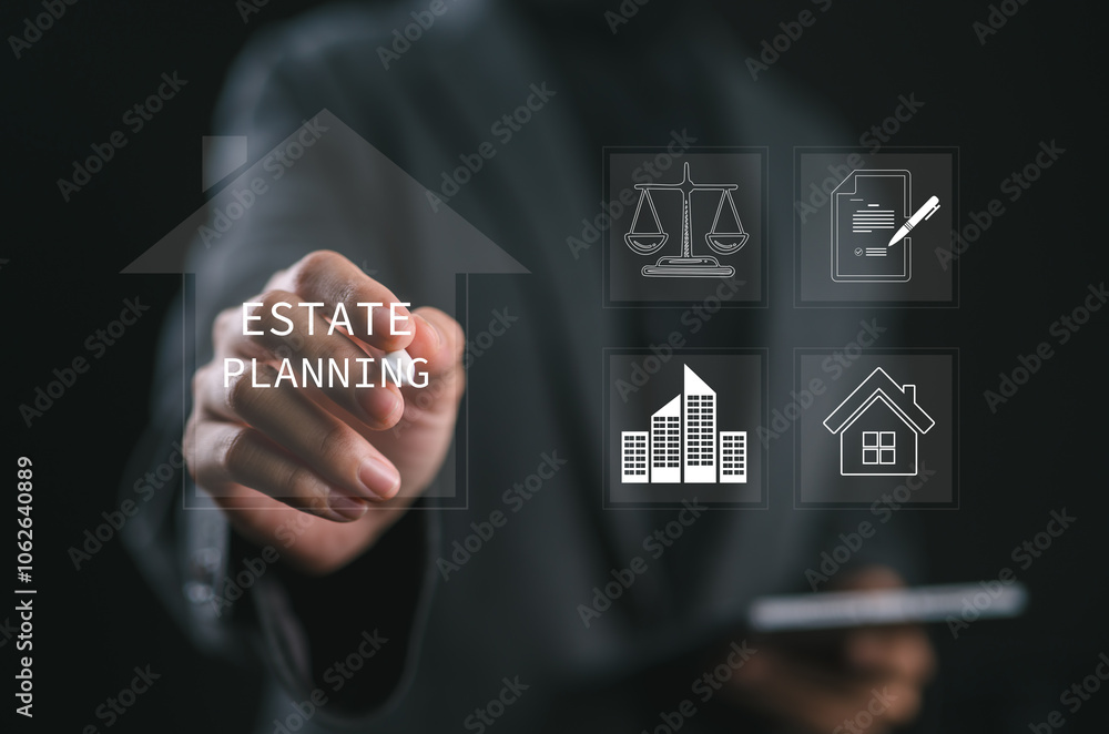 Estate Planning concept. Planning for the transfer of assets and Inheritance tax. Businesswoman touching estate planning icons on virtual screen.