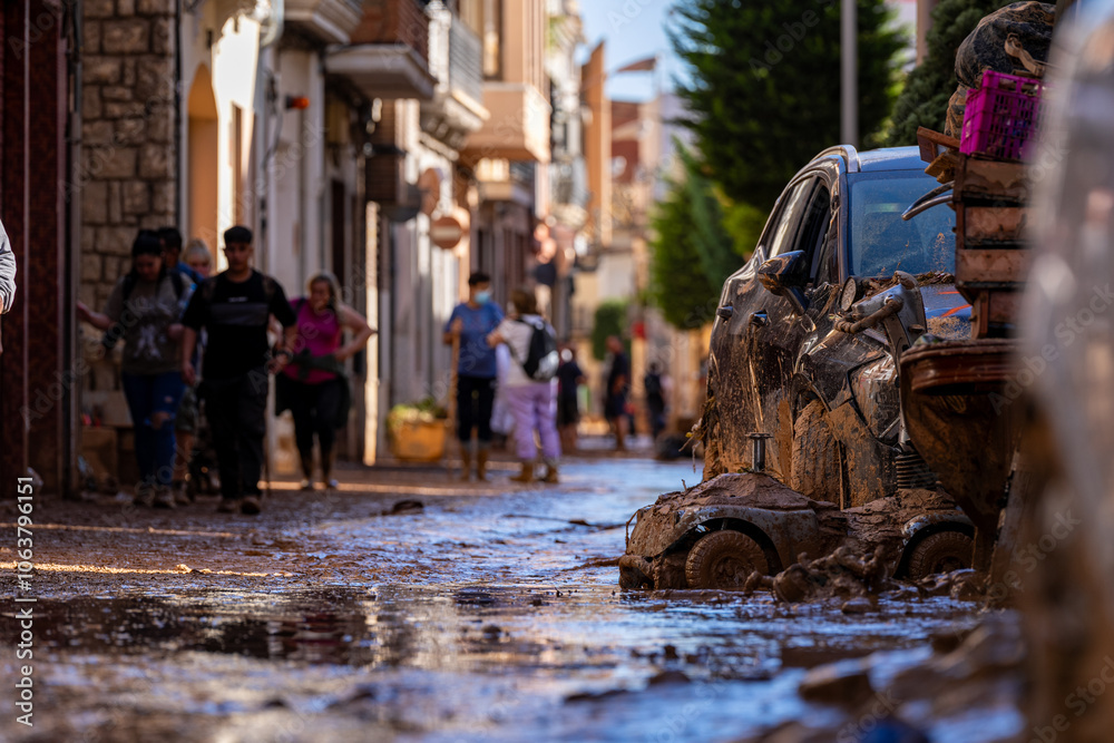Photo shows the aftermath of the recent flood in Alfafar, Valencia, Spain. Captured are damaged homes, roads, submerged parking lots, and the efforts of residents and volunteers to clean and rebuild.