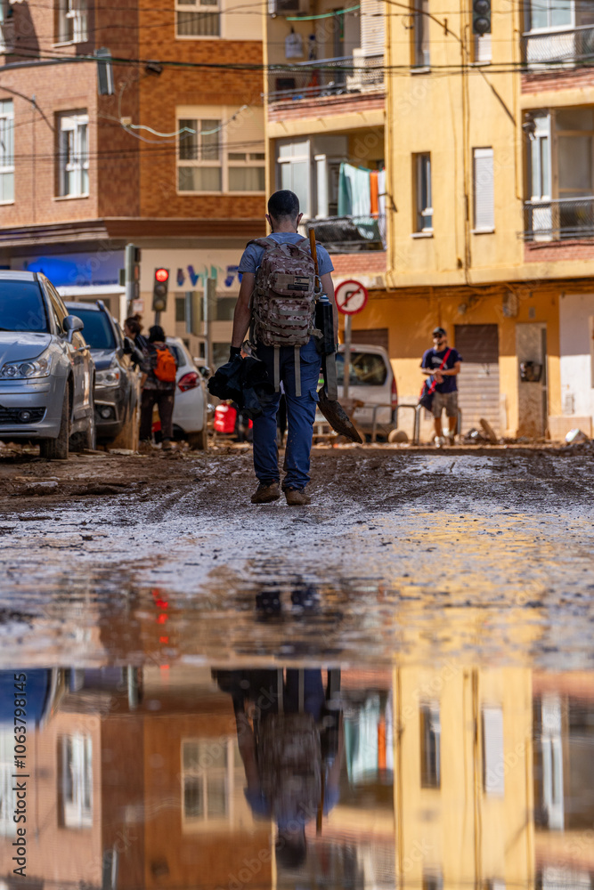 Photo shows the aftermath of the recent flood in Alfafar, Valencia, Spain. Captured are damaged homes, roads, submerged parking lots, and the efforts of residents and volunteers to clean and rebuild.